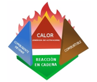 Es un proceso químico donde se genera la “reacción en cadena de la combustión”, para que allá suceda intervienen 4 factores a saber: Oxigeno (aire ambiental), temperatura (encendedor, fosforo), combustible (papel, nafta), de la suma de estos 3 factores surgirá el 4 que es la suma de los 3 que llamaremos “reacción en cadena de la combustión”, representada en dos figuras geométricas como son el triangulo y tetraedro del fuego.