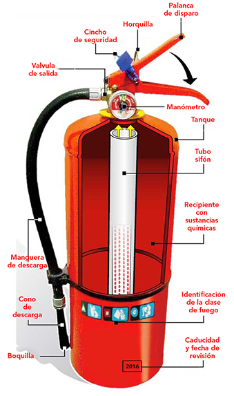 En la imagen vemos un Matafuego de POLVO QUIMICO DE 5 KG, estos son los más comunes en comercios, estacionamientos, industrias etc.